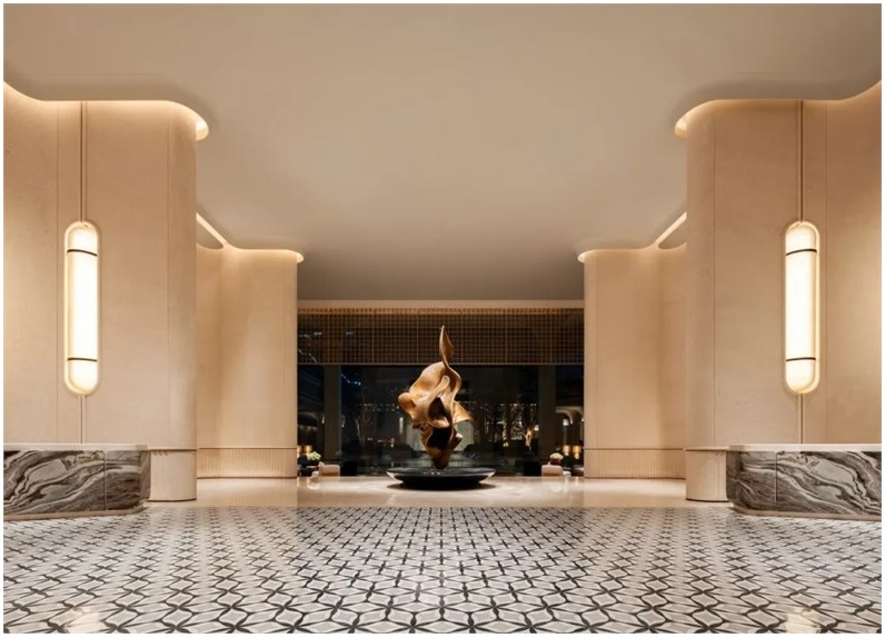 “非遺銅門”|約7.5米高的“非遺銅門”,是由中國國寶級非遺大師朱炳仁首創。在大門蝕刻工藝的基礎上刻畫生命之樹,銅門兩側融合了非遺錘紋鍛造工藝;門把手采用掐絲琺瑯與鏨刻工藝。