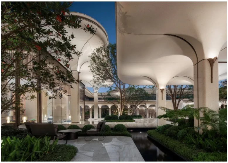 約6000㎡會所,三進院空間。會所以珠水為題,串聯起各個空間。布局上為一核心中軸兩翼的對稱分布,南北是歸家雙大堂“鎏光映庭”,中軸為約1800㎡的內庭院,兩翼打造了會客、休閑等功能區。