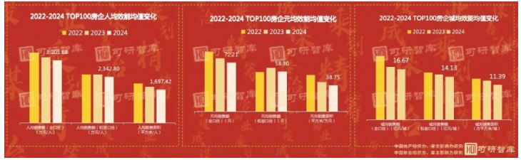 TOP100房企大部分效能數據均值下降,2024年TOP100房企人均全口徑銷售額均值3200萬,人均權益銷售額2300萬,元均權益銷售額58.9元,民營企業部分數據出現探底狀態。