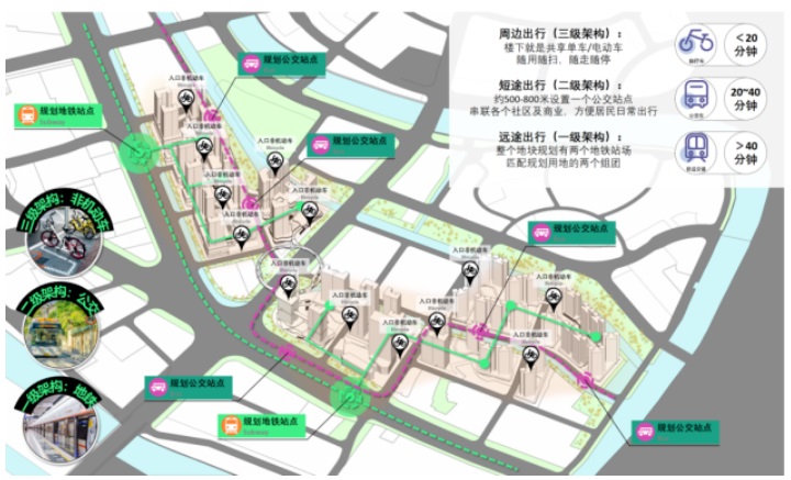 采用出行距離為導向的三級交通組織架構,通過高效整合公共交通資源,實現地鐵、公交及非機動車等多種交通方式的互補與融合,并確保各層級交通流線緊密銜接,為居民提供了更加舒適、便捷的出行體驗。同時效緩解了城市交通壓力,提升了整體交通系統的效率與服務質量。