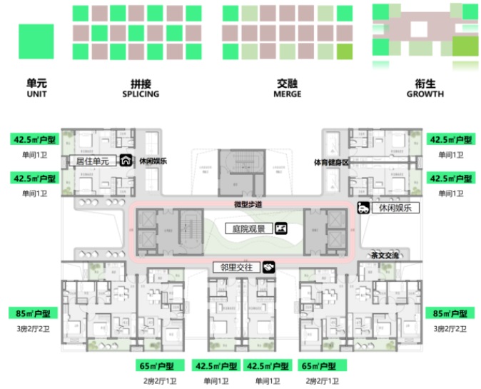 我們綜合考慮社區布局的合理性與高效性,采用單元模塊化推演方法。通過精細化的設計,這些單元模塊能夠自由組合,靈活融入社區的各項功能之中,從而構建一個既多元化又統一和諧的居住環境。在此基礎上,設置了一體化微社區活力連廊,這些連廊巧妙地連接起各個居住單元,不僅延伸了家的半徑,更在情感上拉近了居民之間的距離。