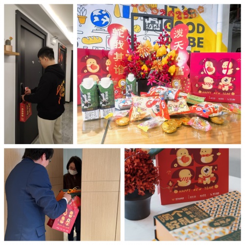 越秀星廷、越秀星寓、越秀星鄰工作人員和管家特別定制新春福袋,喜氣可愛的蛇年禮袋,“潑天富貴蛇我其誰”新春對聯,承載祝福的賀卡,星星毛絨包掛,新年零食糖果,越秀旗下《聲生不息·大灣區季》冠名健康品牌謝添地牛奶.用心準備,只為親手給星友租戶們袋來好運,讓身處異鄉的星友租戶們也能感受家的溫暖。