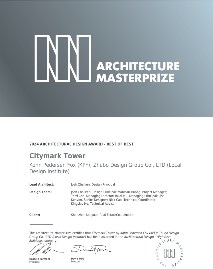 Architecture MasterPrize 美國建筑大師獎前身為AAP美國建筑獎,是最具權(quán)威的建筑獎項之一,旨在表彰全球最優(yōu)秀、最有創(chuàng)意的建筑、室內(nèi)和景觀項目。據(jù)官方數(shù)據(jù)報道,本屆AMP賽事共吸引了81國家和地區(qū),城脈中心從全球頂尖水平的數(shù)千份作品中脫穎而出,摘獲最佳高層建筑獎,取得最高級別榮譽[Best of Best]。是深圳地標實力再一次擲地有聲的證言,更是中國超高層建筑進階發(fā)展的又一歷史時刻。
