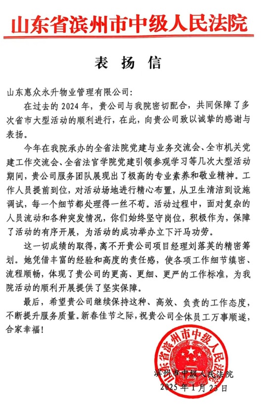 圖:濱州市中級人民法院專函表揚信
