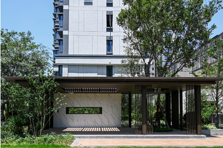 建筑立面設計上,項目團隊以“現代為形,東方為韻”,橫向線條勾勒現代輪廓,淺色真石漆搭配石材干掛與金屬花窗,頂部抽象化飛檐構架呼應中式美學,形成 “橫如流水,縱似山巒” 的立體韻律;景觀設計以“鷺洲尋跡”為主題,將廈門古港文化融入場景,260 米有氧環跑綠道串聯核心景觀,讓自然生態與人文底蘊在社區中交融共生。