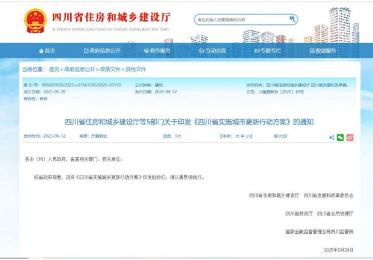 四川經濟網訊(記者 李洋)6月12日,記者從四川省住房和城鄉建設廳官網獲悉,近日,四川省住房和城鄉建設廳、四川省發展改革委、四川省財政廳、四川省自然資源廳、國家金融監督管理總局四川監管局聯合印發了《四川省實施城市更新行動方案》(簡稱《行動方案》)。《行動方案》提出,2025年,全省要啟動約600個城市更新重點片區,實施約3800個城市更新項目,持續改善城市功能品質,建設高品質宜居空間。