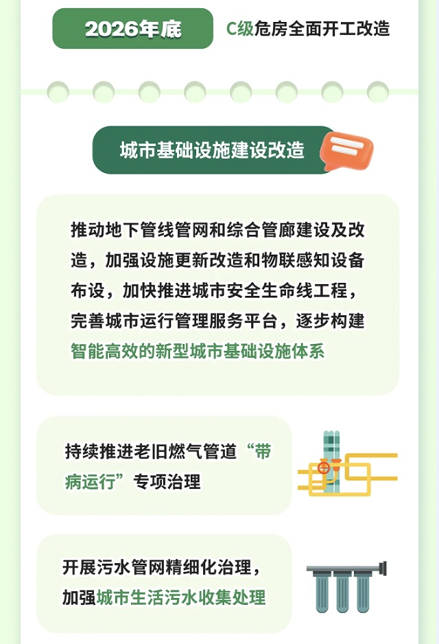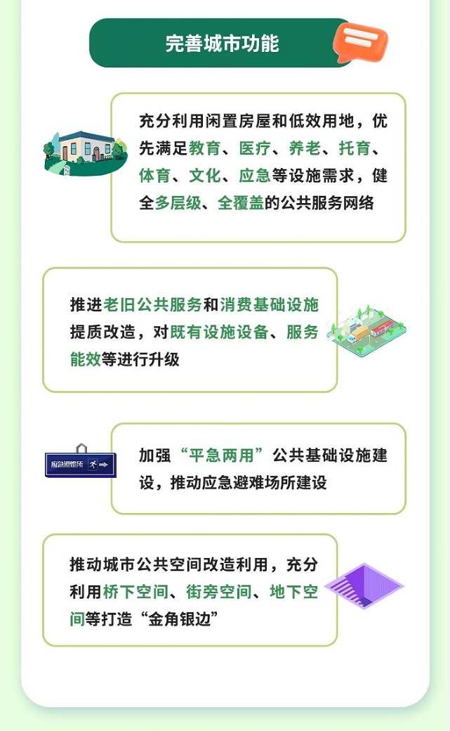 《行動方案》圍繞八大重點任務展開部署,包括圍繞城鎮老舊小區整治改造、城中村和老舊街區廠區更新改造、既有建筑改造利用、城市基礎設施更新改造、城市生態系統修復、歷史文化保護傳承、完整社區建設、城市功能完善,著力提升城市整體環境品質和綜合承載能力。