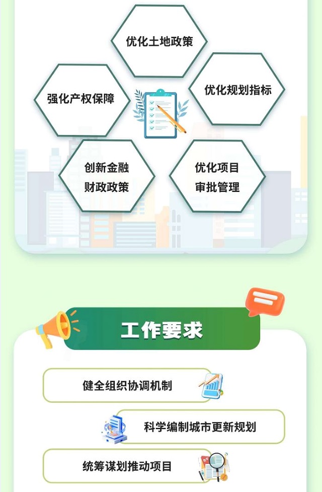 為保障更新行動順利推進,《行動方案》從優化土地政策、強化產權保障、優化規劃指標、創新金融財政政策、優化項目審批管理等五方面,明確了城市更新的具體支持政策,進一步釋放土地與空間潛力,激勵市場多元參與。