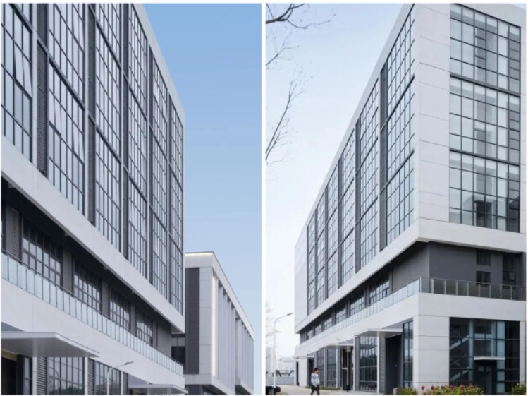 The standalone R&D buildings feature mid-low rise structures with clean façades, combining precast concrete and aluminum sunshades for modern industrial aesthetics. The companion office tower rises as a regional landmark, its innovative curtain wall design creating visual dynamism through fritted glass patterns.