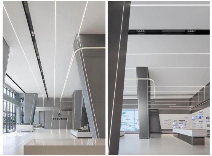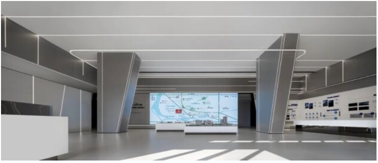 科技為骨:作為“科技營造”理念的核心。科技元素在招商中心的設(shè)計(jì)中無處不在,金屬鋁板、線性燈光、智能導(dǎo)覽系統(tǒng)和虛擬現(xiàn)實(shí)體驗(yàn)等元素,提升整體科技感與互動(dòng)性,成為了連接參觀者與園區(qū)科技創(chuàng)新成果的橋梁。