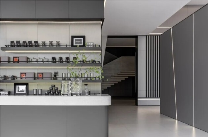 水吧洽談區(qū),商務(wù)與生活的「溫柔結(jié)界」。弧形吧臺(tái)采用陽極氧化鋁材質(zhì),營造城市客廳般的休閑氛圍。半圍合卡座配置莫蘭迪色系皮革座椅,促進(jìn)商務(wù)洽談在咖啡香與藝術(shù)氛圍中的自然融合。