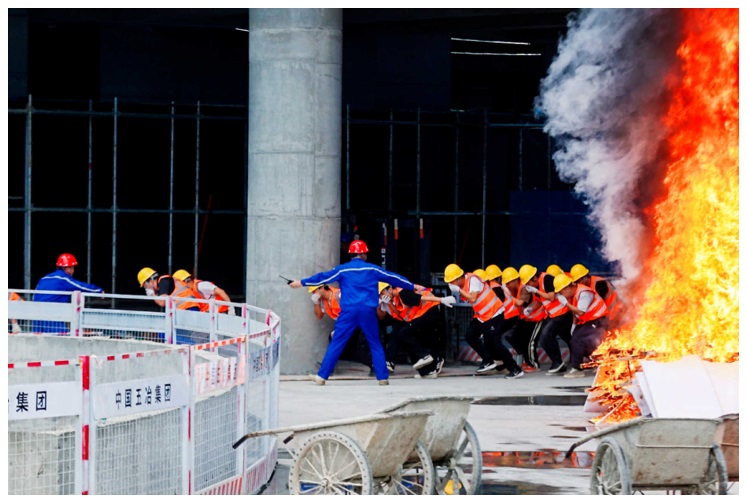 會上開展了以動火作業引燃建筑保溫材料的火災事故和汛期暴雨造成的基坑坍塌事故為科目的建筑施工綜合應急演練。