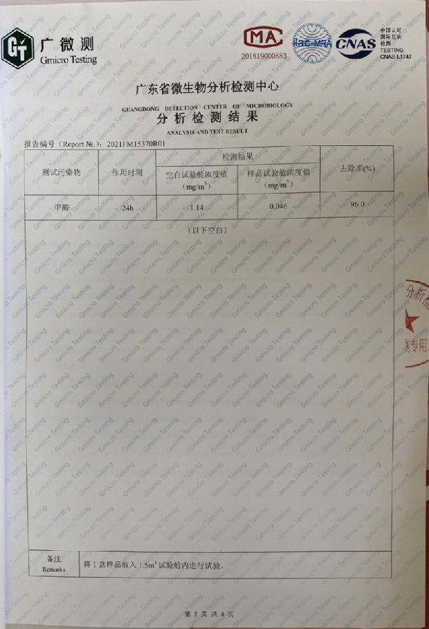 這款葉廣泥不止是除甲醛,針對苯 苯系物 tvoc 異味等污染都有很好的吸附分解作用.根據《中國室內空氣質量標準》(GB/T18883-2002),有效的推薦葉廣泥(甲醛去除率96%,甲苯去除率98%)附檢測報告:
