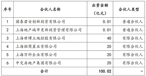 除萬科、招商蛇口外,上海世博土地控股認(rèn)繳出資40億元,中交房地產(chǎn)集團(tuán)認(rèn)繳出資20億元。上海城市更新引導(dǎo)基金將聘請國君創(chuàng)投擔(dān)任基金的管理人,雙方分別出資0.01億元。