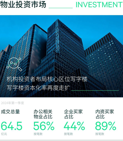 2024年第一季度,北京物業投資市場交易一共錄得九筆交易,共計交易總額64.5億元,環比上漲24%,同比下降7%。