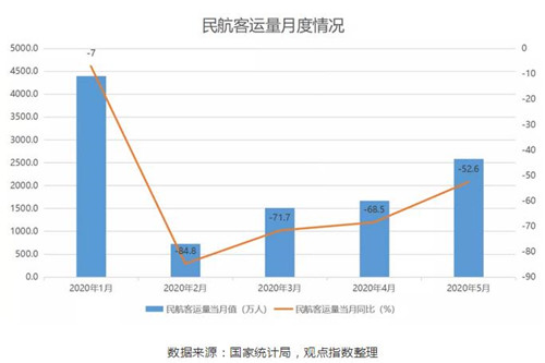 從民航數(shù)據(jù)上看,5月單月2583.1萬人,同比下降52.6%,1-5月累計11664萬人,同比下降56.5%;1-4月累計民航客運量9081萬人,同比下跌57.5%。單月來看,民航數(shù)據(jù)正快速恢復,但離正常狀態(tài)仍有相當差距。