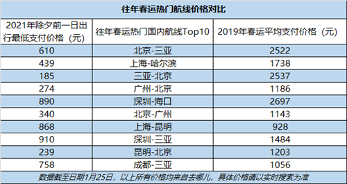 去哪兒平臺上,2019年春運平均支付價格在2500元左右的熱門航線今年均不到千元,最便宜的甚至不滿200元。來源:去哪兒