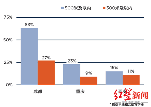 在成都,距離地鐵站點100米內的甲級寫字樓里的零售與貿易和消費者服務企業(yè),相比離地鐵站點超過800米的情況,辦公面積高4到5個百分點。