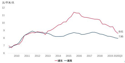 浦東/浦西甲級寫字樓十年租金走勢(2010年——2020年三季度)