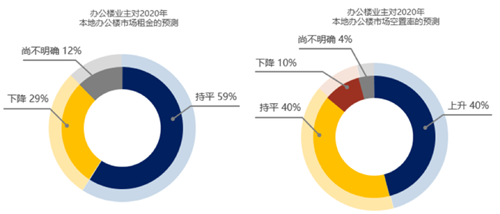 在受訪辦公樓業(yè)主中,59%的辦公樓業(yè)主認(rèn)為租金將保持穩(wěn)定,而29%則預(yù)計(jì)租金將下降;在空置率方面,40%的辦公樓業(yè)主認(rèn)為空置率將持平,同樣有40%的業(yè)主預(yù)期空置率將上升,而預(yù)期空置率將下降的業(yè)主僅占比10%。