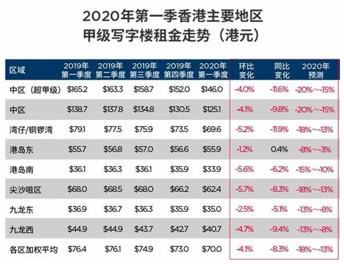 目前香港寫字樓租賃需求變得疲弱,展望本年全年的待租率將維持在雙位數的水平,整體租金在本年內將下調13-18%,中區的跌幅更會多達15-20%。