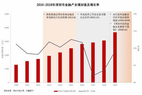 根據(jù)歷史發(fā)展經(jīng)驗(yàn),重大金融政策的發(fā)布常常對金融業(yè)的發(fā)展速度產(chǎn)生重大影響。以大灣區(qū)的金融重鎮(zhèn)深圳為例,2012年國務(wù)院通過深圳前海金融改革創(chuàng)新先行先試政策后,深圳金融業(yè)增加值增長率在次年重新回到兩位數(shù)的高速發(fā)展軌道。2015年末,中央經(jīng)濟(jì)工作會(huì)議首次提出去杠桿,金融業(yè)增速在隨后幾年也隨之下滑。央行于2018、2019連續(xù)兩年宣布金融業(yè)對外開放的具體措施,市政府也于2018年末發(fā)布《深圳市扶持金融業(yè)發(fā)展若干措施》,又再次助力深圳金融業(yè)擺脫因去杠桿受挫的頹勢。