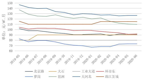 圖:2019年5月~2020年6月深圳重點商圈甲乙級寫字樓租金走勢