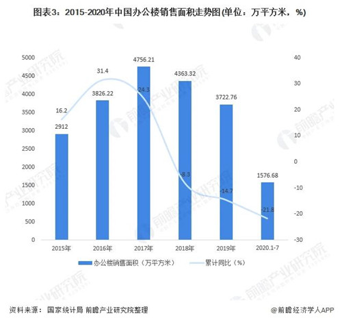 辦公樓指機關、企業、事業單位行政管理人員,業務技術人員等辦公的業務用房,現代辦公樓正向綜合化、一體化方向發展。辦公寫字樓是專業的商業辦公的場所。一般具有較好的地理位置,相關的物業和服務設施水平高,具有聚集的商業圈,效率較高。2018年,中國辦公樓開發投資規模跌破6000億元,僅為5996.33億元,2019年投資完成額略有回升,至6163億元,增長2.8%。2020年受新冠疫情影響,我國辦公樓發展受到較大沖擊,截止2020年7月,我國辦公樓開發投資規模下降2.1%至3262億元。