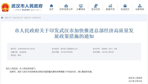 房訊網訊 近日,武漢市發布《關于印發武漢市加快推進總部經濟高質量發展政策措施的通知》,加快推進總部經濟高質量發展,優化產業結構,提升城市功能,增強城市資源整合力和輻射帶動力,有效支撐現代化大武漢建設。