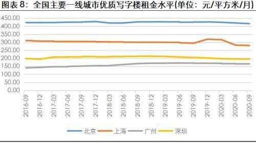 因寫字樓的地區聚集效應更為顯著,各城市間優質寫字樓租金存在較大差異。國企、央企總部多位于北京,得益于總部經濟效應,北京地區優質寫字樓租金與其它一線城市拉開較大距離。2020年9月末,北京優質寫字樓租金為416.10元/平方米/月,高出第二位的上海136.90元/平方米/月;同期末,深圳及廣州寫字樓租金分別為194.30元/平方米/月和163.80元/平方米/月,租金價格分別位列全國第三和第四位。此外,受益于長三角一體化背景下南京與杭州都市圈協調聯動的強化,南京和杭州優質寫字樓租金較高,2020年9月末分別為119.40元/平方米/月和116.70元/平方米/月,位居二線城市前列,其余二線城市每平方米月租金均不超過100元。同期末,受新冠疫情影響,全國主要城市寫字樓租金也普遍下降,但相較于零售物業租金而言,降幅較小。