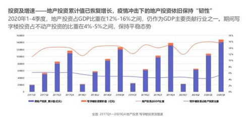 結(jié)合地產(chǎn)市場表現(xiàn)來看, 2020年1-4季度,地產(chǎn)投資占GDP比重在12%-16%之間,仍作為GDP主要貢獻行業(yè)之一。寫字樓投資占不動產(chǎn)投資的比重在4%-5%之間,保持平穩(wěn)態(tài)勢。而疫情沖擊下的地產(chǎn)投資依舊保持“韌性”,具體到一線城市商辦土地方面,成交供應(yīng)量井噴式增長,成交率大幅提升。2020年1-12月,一線城市供應(yīng)商辦土地209幅,環(huán)比上漲31%,市場信心逐步回升。