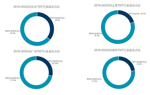 房訊網訊 據戴德梁行市場報告指出,TMT行業過去五年在寫字樓租賃市場扮演了重要角色。數據顯示,從2016年至2020年,TMT行業在北上廣深四個一線城市寫字樓租賃占比分別達到36%、20.3%、28.3%及23%。