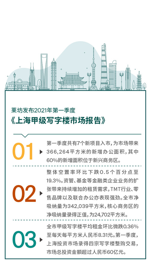 萊坊上海辦公樓服務部主管李章南表示,不少寫字樓業主對于市場的樂觀情緒已經表現在市場報價上調以及裝免折扣的減少,部分分市場的租賃雙方的租金談判空間在進一步縮小。我們預計2021年剩下的三個季度內市場將有超過150萬平方米的寫字樓新項目入市,其中超過半數的項目位于徐匯濱江以及前灘這些新興區域。第二季度,在業主方持續看好市場的樂觀情緒下,市場租金有望出現小幅反彈,而市場空置率將進一步走低。