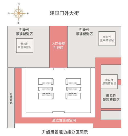 在北京IFC國(guó)際財(cái)源中心原有外部景觀設(shè)計(jì)中,臨近長(zhǎng)安街,直通大樓北門(mén)的大廈北廣場(chǎng)以7米橫寬的北向景觀通道+雙景觀塑造區(qū)「夾道」的空間格局,成就標(biāo)志性奢闊景觀禮序。但在以車行為主導(dǎo)的長(zhǎng)安街沿線,強(qiáng)調(diào)威儀的景觀設(shè)計(jì)卻讓北京IFC北廣場(chǎng)顯得「大氣有余,靈動(dòng)不足」,難以實(shí)現(xiàn)交通工具與城市行人「動(dòng)靜共融」的平衡。