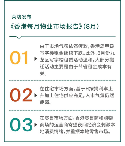 八月份租賃活動溫和,大部分搬遷都跟節(jié)省成本有關(guān)。跟7月份一樣,主要租賃交易以3,000平方英尺以下及租金每平方英尺港幣22元的中小型面積寫字樓為主。電子和制造公司的租賃活動較為活躍。