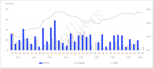 二季度深圳甲級寫字樓市場凈吸納量約7.2萬平方米,空置率微幅下調至27.4%,尋求改善辦公環境、降本增效的需求較為活躍,然而成交落定耗時較久,越來越多的業主高度關注續租率。