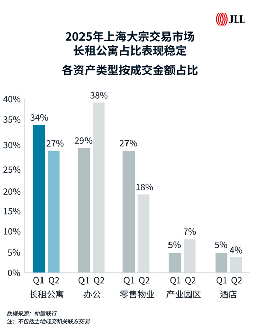 盡管2025年上海大宗交易市場面臨挑戰,長租公寓板塊卻表現亮眼。截至8月,該資產類別的成交金額已達71億元,接近2024年全年總額(77億元)。尤其在第一季度,長租公寓以34%的成交金額占比位居市場第一,第二季度以27%的占比占據第二,顯示出極強的資產韌性和資本吸引力。