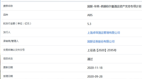 11月18日,據上交所消息,國聯-華英-卓越鉑爾曼酒店資產支持專項計劃獲上交所通過。