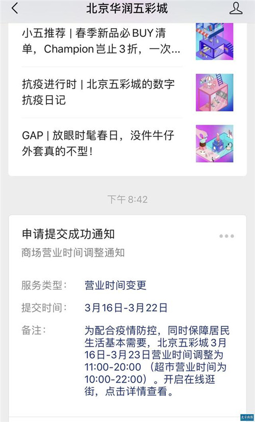 3月15日,北京華潤五彩城、暖山生活廣場、金源新燕莎MAII等商場均發布公告稱,從3月16日起,商場將延長營業時間。