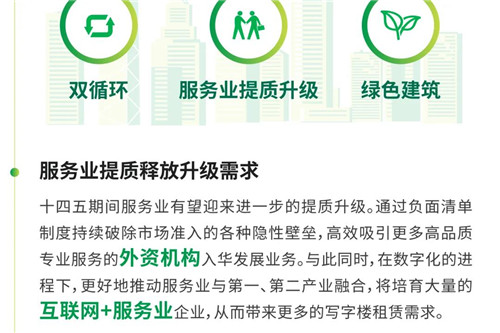日前,國家“十四五”規劃綱要全文發布,再次強調了經濟提質增效、創新驅動發展、城鎮化和消費升級、可持續等重點議題。CBRE世邦魏理仕近日發表《中國“十四五”規劃解讀:2021-2025年國家發展目標及其對房地產市場的影響》,梳理未來五年中國主要經濟發展指標和目標,并提出覆蓋寫字樓、零售物業、產業地產、物業投資等板塊發展的關鍵詞。