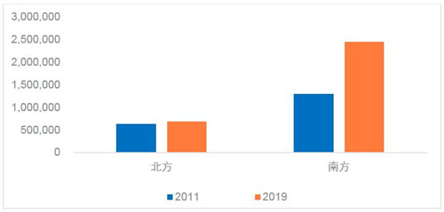 2015年至今,北方經(jīng)濟(jì)對全國經(jīng)濟(jì)的貢獻(xiàn)率逐年下滑,從2015年的43.2%下降至2019年的35.4%,降幅高達(dá)7.8個(gè)百分點(diǎn)。2019年,南方省份GDP平均增幅為7.1%,較北方省份高出1.4個(gè)百分點(diǎn)。在社會(huì)消費(fèi)品零售額方面,2010至2019年,南方省份的社消總額增長迅猛,平均增幅為230%,而北方的平均增幅僅為117.7%。