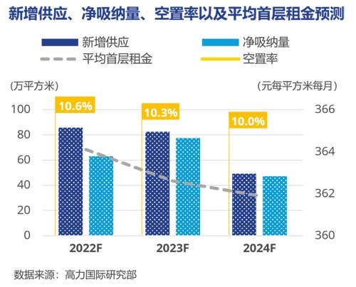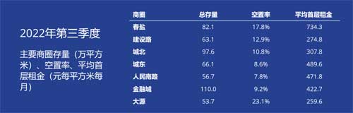 本季,受到成都疫情反彈及限電等影響,致使八九月市場活動放緩,幾近暫停,市場需求減弱,當季凈吸納量錄得約-11.8萬平方米。同時,待入市項目工期日程等方面受阻,年底新項目普遍延期,當季未錄得新增供應。全市空置率環比上升1.3個百分點至11.4%。全市平均首層租金環比下降0.3%至364.1元每平方米每月。