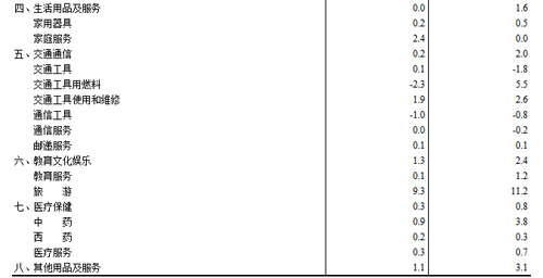 其他七大類價(jià)格同比六漲一降。其中,其他用品及服務(wù)、教育文化娛樂、交通通信價(jià)格分別上漲3.1%、2.4%和2.0%,生活用品及服務(wù)、醫(yī)療保健、衣著價(jià)格分別上漲1.6%、0.8%和0.5%;居住價(jià)格下降0.1%。