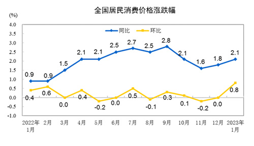 2023年1月份,全國(guó)居民消費(fèi)價(jià)格同比上漲2.1%。其中,城市上漲2.1%,農(nóng)村上漲2.1%;食品價(jià)格上漲6.2%,非食品價(jià)格上漲1.2%;消費(fèi)品價(jià)格上漲2.8%,服務(wù)價(jià)格上漲1.0%。