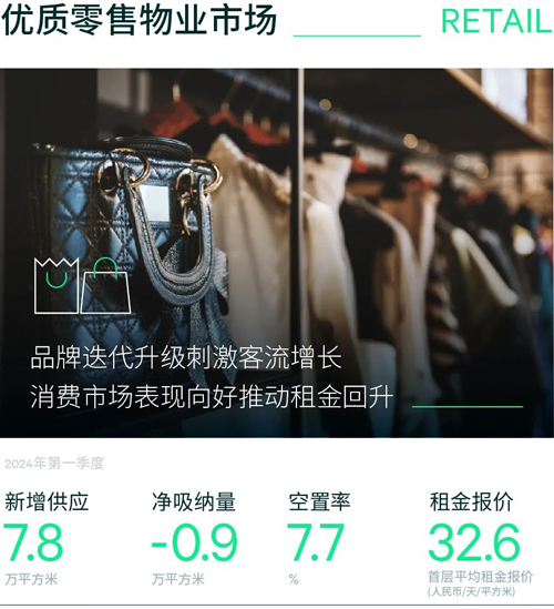 2024年第一季度,北京零售物業市場改造更新項目王府井喜悅重裝開業,同期次級商圈一座購物中心和一座百貨停業,項目內品牌同時撤出導致凈吸納量為負。受益于部分前期高空置項目完成品牌調改,全市空置率環比小幅回落0.3個百分點至7.7%。