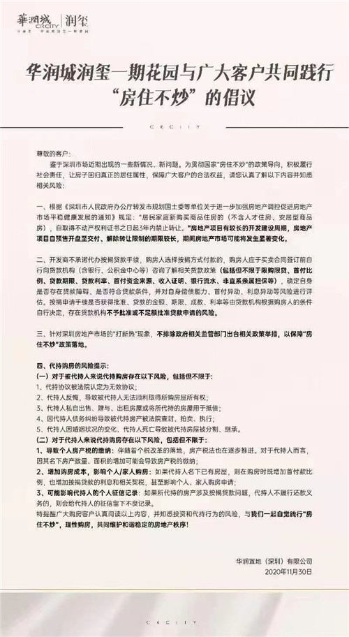 11月30日晚間,有著深圳“網紅盤”之稱,出現“萬人搖號”、“眾籌打新”等情況的華潤城潤璽發布了一封名為“房住不炒”的倡議。