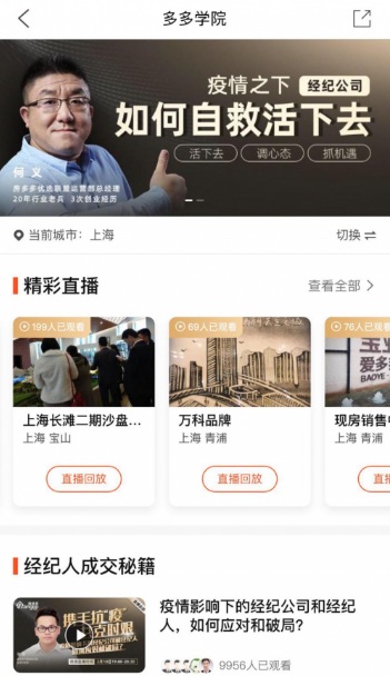 除業(yè)務(wù)相關(guān)的全新功能上線和迭代外,新版本開辟了“多多學(xué)院”專屬頻道。據(jù)了解,多多學(xué)院是房多多為經(jīng)紀(jì)人打造的學(xué)習(xí)成長陣地,為經(jīng)紀(jì)人提供技能成長培訓(xùn),于2月20日正式上線。目前多多學(xué)院已上線近百款專業(yè)類課程,包含專家直播、從業(yè)技能培訓(xùn)、產(chǎn)品工具培訓(xùn)三大類。經(jīng)紀(jì)人可在多多學(xué)院首頁及課程列表頁,按照分類查看精品課程,包括經(jīng)紀(jì)人成交秘籍、多多賣房產(chǎn)品指南等。同時,多多學(xué)院所有知識內(nèi)容全部免費(fèi)開放,助力平臺百萬經(jīng)紀(jì)人提升專業(yè)化能力和服務(wù)水平,為行業(yè)發(fā)展帶來新動力。