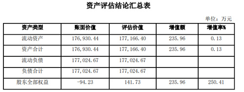 按照資產(chǎn)基礎(chǔ)法評估,武漢怡置明鴻在評估基準(zhǔn)日的資產(chǎn)總額賬面價值為17.69億元,評估價值為17.72億元,增值率為0.13%,負(fù)債總額賬面價值為17.70億元,評估價值為17.70億元,無增減值,股東全部權(quán)益賬面價值-94.23萬元,評估價值為141.73萬元,增值率為250.41%。