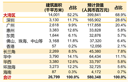 大灣區作為佳兆業多年來深耕布局的重要區域,灣區土儲占到了總土儲備面積的52%,貨值近4000億,其中深圳、廣州兩大核心城市占總土儲貨值約50%。