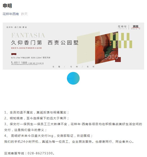 房訊網訊 10月28日,“花樣年西南”官微發布申明稱,全員勸退不屬實,明知艱難,至今選擇留下的遠大于離開。花樣年表示,花樣年·西南各項目均在積極備戰美好生活空間的交付,保交付—保民生—保員工三大鐵律不變。